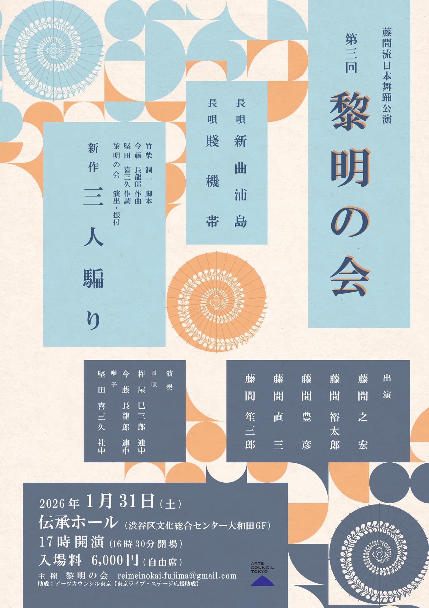 | <演目> | 長唄 新曲浦島 之宏 裕太郎 笙三郎 長唄 賤機帯 豊彦 直三 新作 三人騙り 今では上演が困難となった名作「三人片輪」を元に、現代の倫理に則りながら、黎明の会が新たな提案として挑む新作舞踊です |